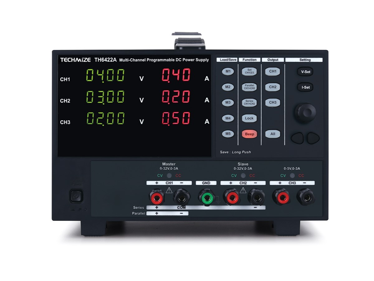 Номинальные характеристики: CH1 – 0-32 В/0-3 A/96 Вт, CH2 – 0-32 В/0-3 A/96 Вт, CH3 – 0-5 В/0-3 A/15 Вт. Автоматическое переключение между режимами CC и CV. Функция последовательного и параллельного соединения каналов 1 и 2. Интерфейсы: RS232, USB DEVICE. Габариты – 215×133×268 мм, вес – 4.7 кг.